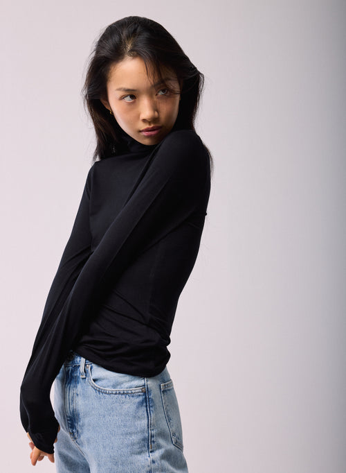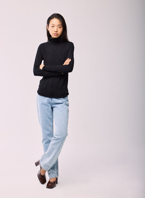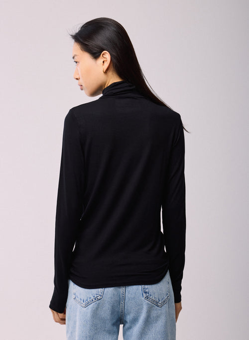 T-shirt Noir Col Roulé Manches Longues en Viscose et Élasthanne